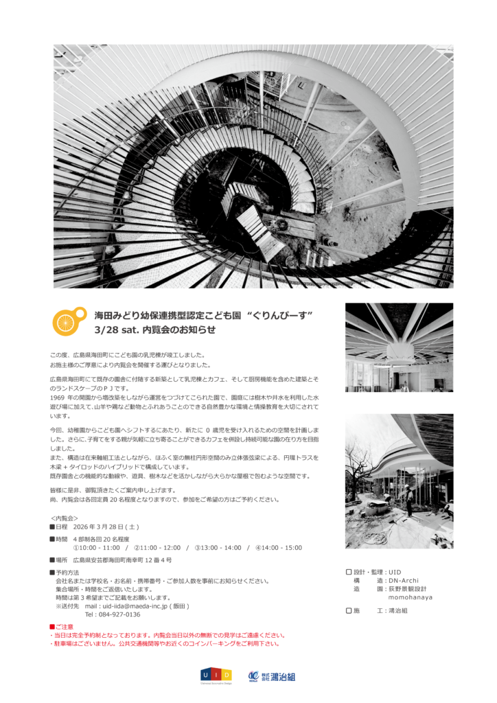 2025年に竣工した3プロジェクトの写真をHPにアップしました。こどもの遊び場をデザインした『つくしの丘』、歯科医院と住居併用の『Q=1/4』、福山駅前の鉄板焼きのお店『伊万里 / Imari』みなさま是非、ご覧ください。