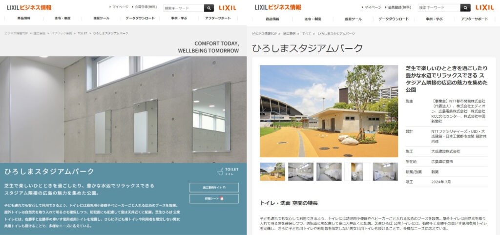 LIXILビジネス情報のパブリック事例 トイレカテゴリー及び施工事例にひろしまスタジアムパーク(ヒロパ)のトイレが掲載されました。